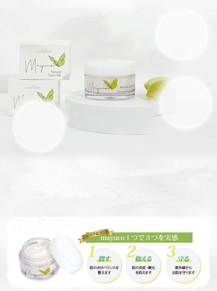 化粧水・美容液・乳液・クリーム・うるおい化粧下地の5つの役割をこれ一つでカバー。 洗顔後のスキンケアはこれだけ。シンプルシルクスキンケアを実現させました。 貴重な国産シルク天蚕のまゆから抽出された美容成分、天蚕シルクフィブロイン(保湿成分)を贅沢に配合しました。