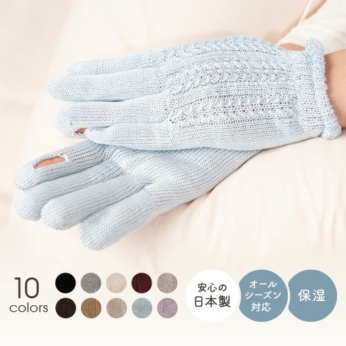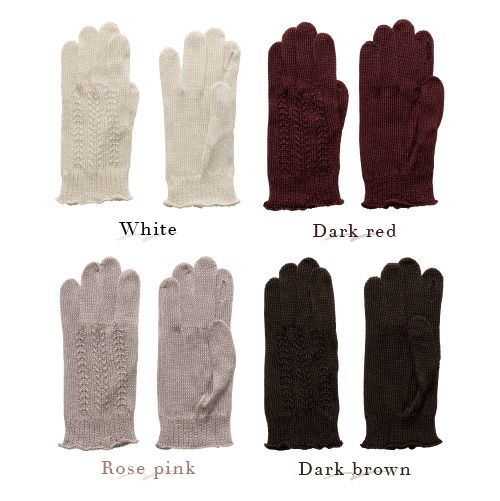 吸湿性・放湿性・保湿性に優れた「天然繊維シルク」。お肌に最も近い天然繊維と言われるほど人体への生体適合性が高く、刺激がないため、アレルギー体質の方にも安心してご使用いただける「シルク100%の手袋」です。しかも、日本製の糸を使い、日本で編み立てをしている素材から生産まで、安心の日本製レディース手袋、毛玉にもなりにくいシルク糸を使用。なんと言っても、一年を通して使えるのがシルクのスゴイところ♪夏は汗を吸収し、余分な水分を放出してくれるので、肌触りサラサラの快適な付け心地♪乾燥が気になり出す寒い冬には、インナー手袋として、モコモコ手袋の下に履くことで、ベタつきやムレもなく、素肌に直接履くより快適な肌触りをご実感いただけます。冬の夜にも手袋を着用したまま就寝してシルクが潤いを逃しません。お休み手袋としても乾燥にお悩みのレディースにおススメ。