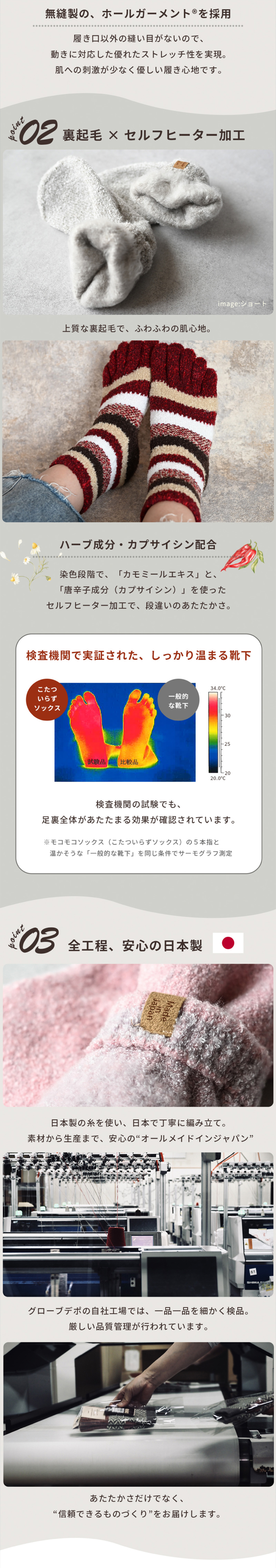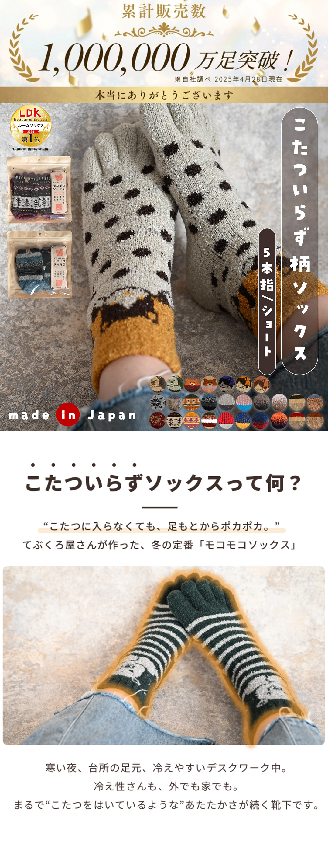 大好評のもこもこソックスにかわいくおしゃれなデザインソックスが新登場。全8柄の20パターンがお選びできます。落ち着いた雪柄やボーダー柄からかわいいクマ柄やネコ柄など足元をかわいく彩ります。もちろん他のソックス同様に足元をしっかりあたためられることは実証済み、シュークリーム糸使用の立体構造で足元ぴったり。チーセル裏起毛の上質なな肌触りは1度使うと病みつきです。さらにセルフヒーター加工でしっかりあたためてくれるので冷え性対策にもおすすめです。