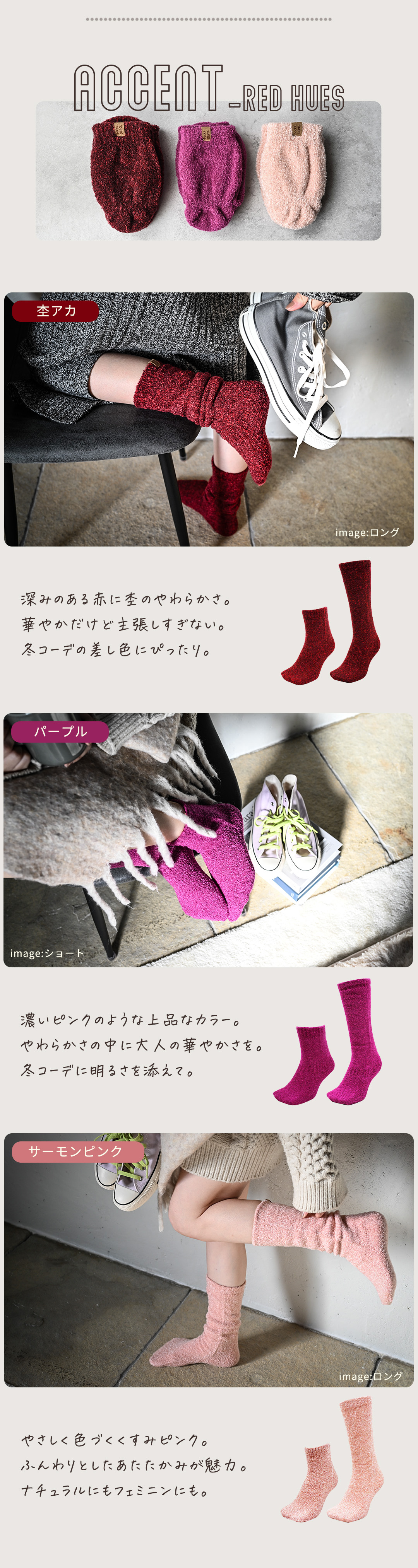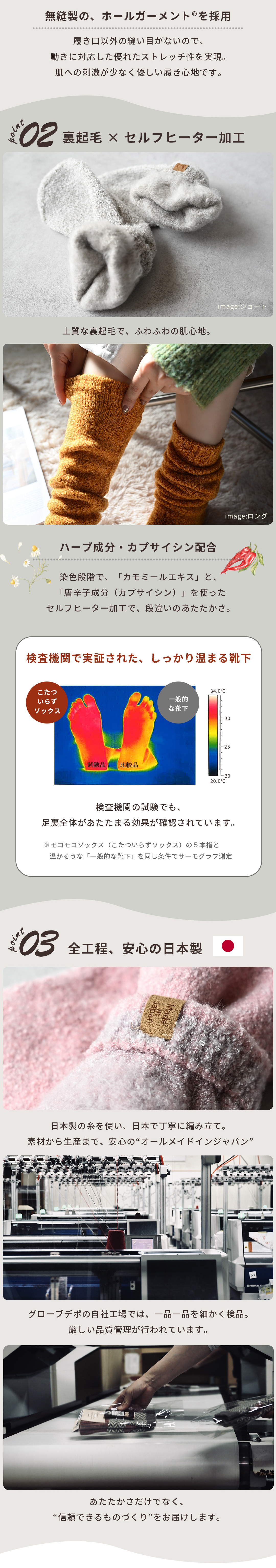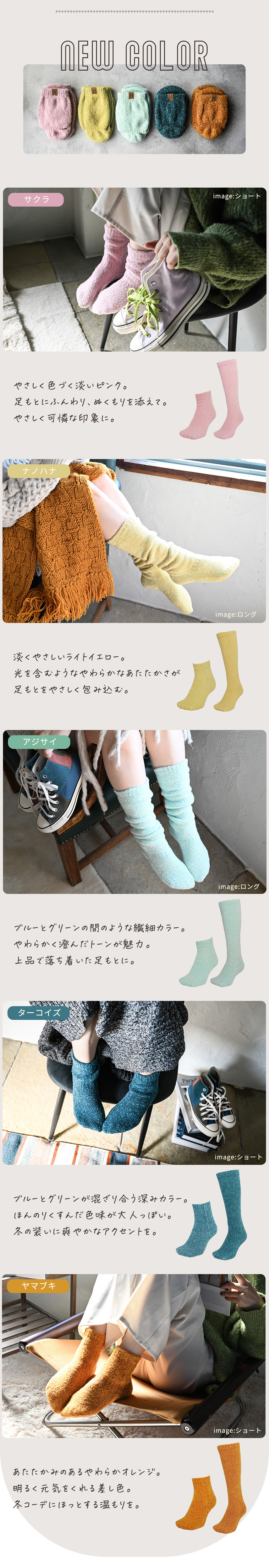 シングルタイプでも、他の靴下では味わえない温かさ!普段履き以外でも、様々なシーンで愛用されているシリーズでカラーバリエーションで豊富だから、足元を彩ります★検査機関でも足裏がしっかりと暖められることを実証済み。 シュークリーム糸を使用した立体編み立て、金属針ならではの裏起毛では不可能な柔らかなタッチは手放せなくなるほど♪ハーブ成分配合のセルフヒーター加工で、自然の力で足先からしっかりと温めてくれるので、冷え対策にもオススメです!