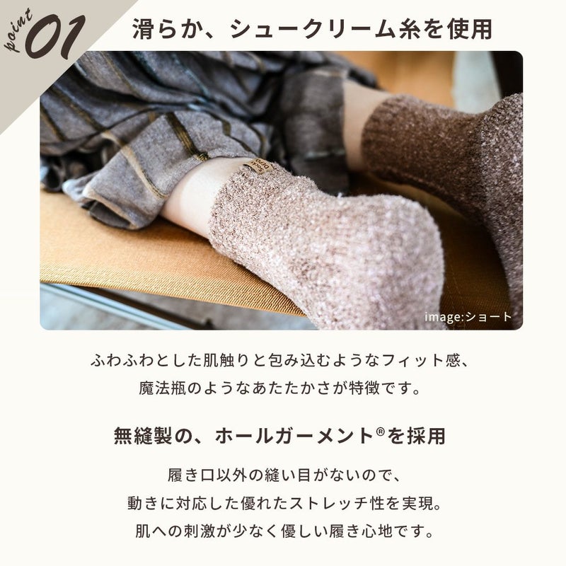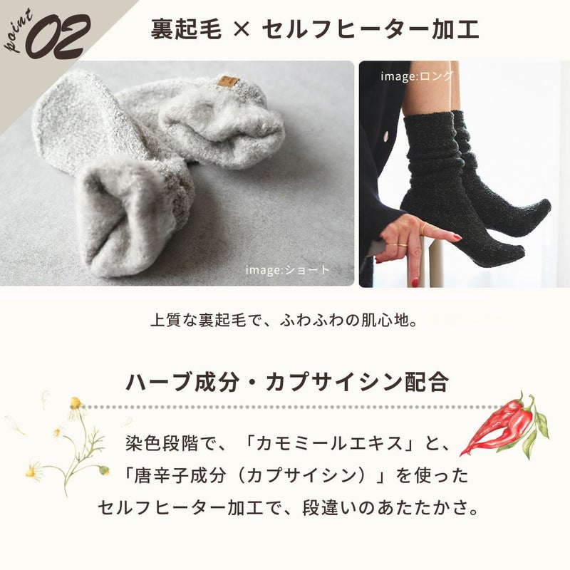大好評のてぶくろ屋さんが作ったモコモコソックスシリーズにゆったり温める先丸ソックスシングルバージョンが登場です。のびのびフィットにふわふわモコモコの肌触り。シングルタイプでもほかの靴下では味わえない暖かさです。 柔らか素材のシュークリーム糸を使用した立体編み立てにより足にぴったりフィット!足全体をゆったり包み込みます。裏側の起毛は、現在ほとんどの企業が「金属針起毛」に移行する中、 当店ではお客様により高品質な商品をお届けしたいという思いから、 チーゼルという天然植物を使用した「チーゼル起毛」を採用。職人の手作業によるきめ細かな起毛は金属針起毛では不可能な柔らかなタッチを生み出し 抜群の肌触りを実感いただけます。更にカプサイシンとカモミール成分配合によるセルフヒーター加工を施しており、 自然の力で血流を良くする効果があるので更にポカポカ。 ショートタイプでくるぶしまでの長さでもしっかり暖かい可愛いソックスです。お部屋でのリラックスタイムやお出かけの際にもどちらでもお使いいただける必需品です。 カラーも豊富な20種類からお選びいただけます。