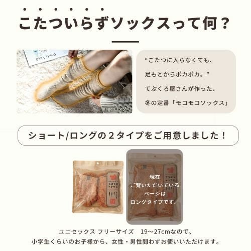 大好評のてぶくろ屋さんが作ったモコモコソックスシリーズにゆったり温める先丸ソックスシングルバージョンが登場です。のびのびフィットにふわふわモコモコの肌触り。シングルタイプでもほかの靴下では味わえない温かさです。柔らか素材のシュークリーム糸を使用した立体編み立てにより足にぴったりフィット!足全体をゆったり包み込みます。更にカプサイシンとカモミール成分配合によるセルフヒーター加工を施しており、自然の力で血流を良くする効果があるので更にポカポカです。ロングタイプで膝下まではいソックスの様に履いても、くしゅくしゅとラフに履いても可愛いソックスです。お部屋でのリラックスタイムやお出かけの際にもどちらでもお使いいただける必需品です。カラーも豊富な20種類からお選びいただけます。