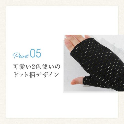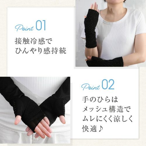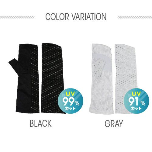 手のひらメッシュ構造なので、ムレにくく涼しく快適♪紫外線83~99%以上カット(生地の色によりカット率が異なります)紫外線からしっかりガード。 手首までしっかりカバーしますので七分袖や上着をはおった時などに最適。 冷房などの冷え対策にも大活躍です♪手のひら側には「すべり止め」が付いており、指先が出ているタイプですので、スマートフォンの操作はもちろん♪ 通勤やドライブ、ガーデニングなど細かい手作業の時にも便利なアイテムです。