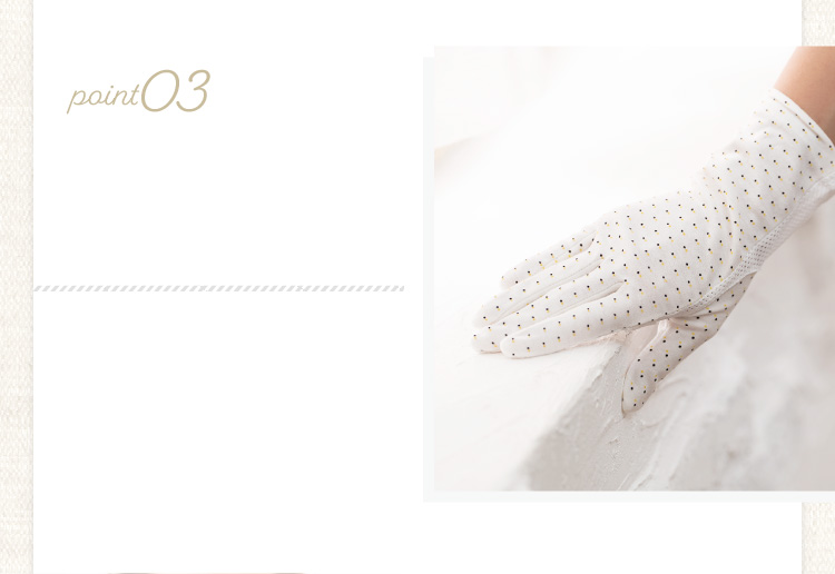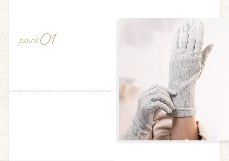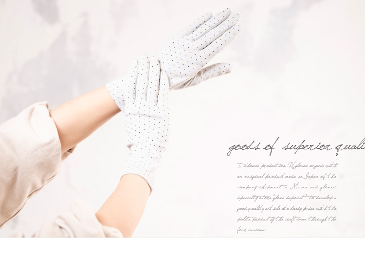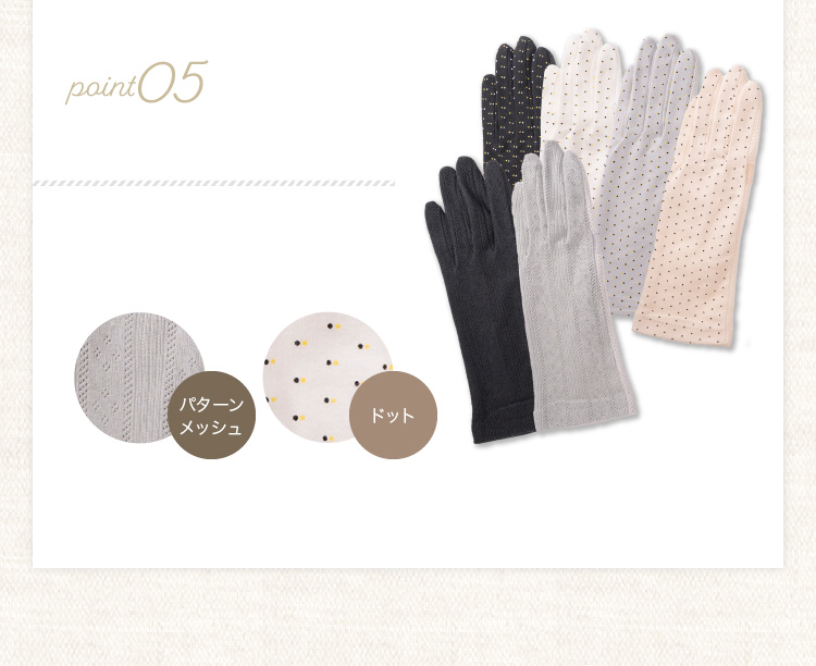 手のひらメッシュ構造なので、ムレにくく涼しく快適♪紫外線83~99%以上カット(生地の色によりカット率が異なります)紫外線からしっかりガード。 手首までしっかりカバーしますので七分袖や上着をはおった時などに最適。上品なパターンメッシュとかわいいドットタイプの2デザインからお選びいただけます。 冷房などの冷え対策にも大活躍です♪手のひら側には「すべり止め」が付いており、 通勤やドライブ喉の際にも安心。メッシュ部分ではスマホの操作も可能です。(個人差がや機種によりスマホの反応が悪い場合がございます。)