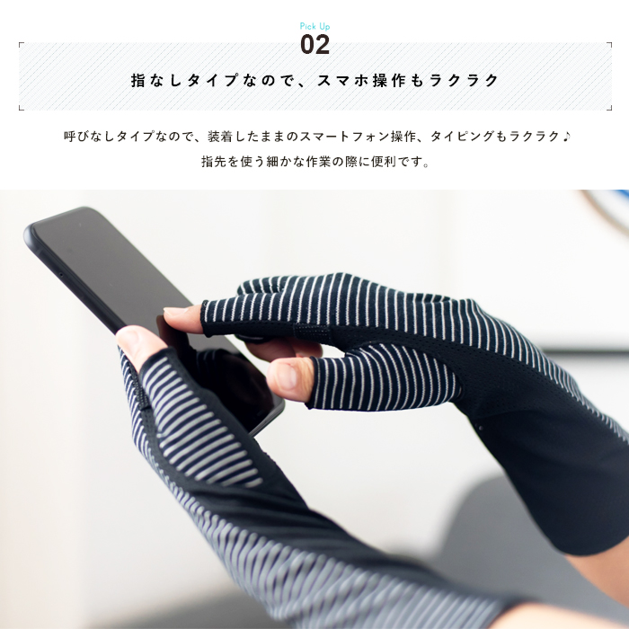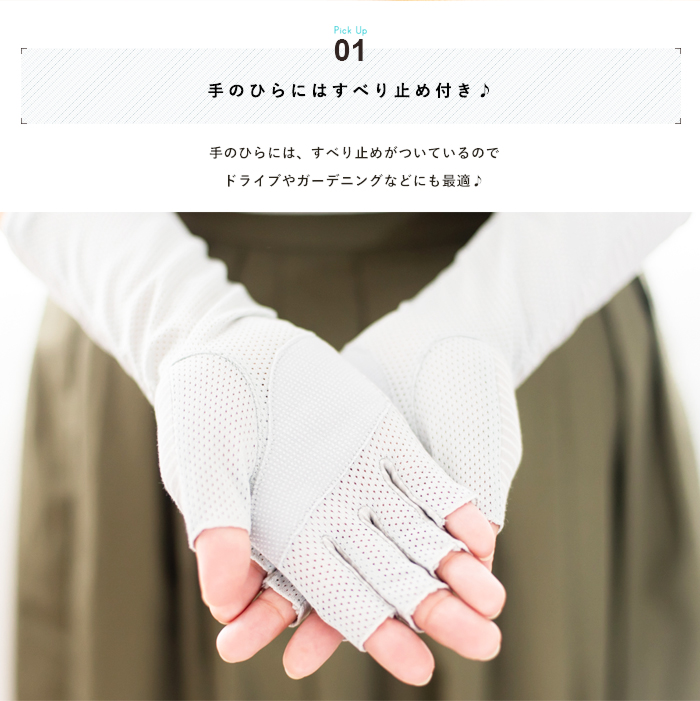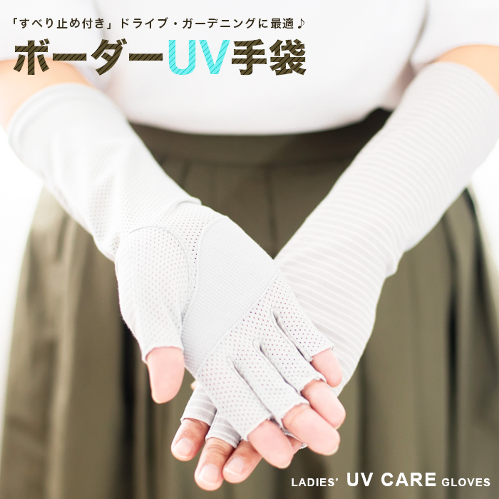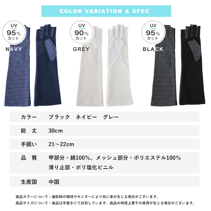 手のひらはメッシュ構造で涼しく快適!通勤・ドライブ・ガーデニングなど紫外線から手元をしっかりガード。総丈30cm丈で通常のショート丈より長めです(大体手首と肘の中間より長めとなります)。快適なフィット感です(生地に多少の伸縮性があり、手の平や指をひろげやすいです。)七分袖や上着をはおった時などにも。冷房などの冷え性対策にも。指切りタイプなので細かな作業やスマートフォンの操作も楽々。さらに滑り止めもついており、ドライブなど、この夏大活躍まちがいなしの使いやすさ!甲の部分は綿100%。サラッとした肌ざわりです。カジュアルなボーダー柄でお洋服にも合わせやすいです♪