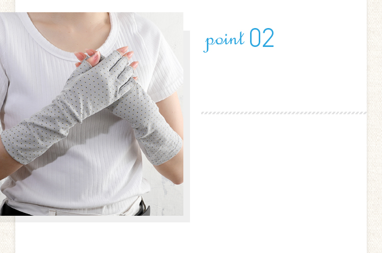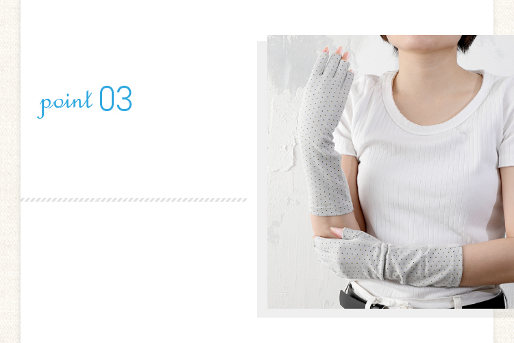 手のひらメッシュ構造なので、ムレにくく涼しく快適♪紫外線83~99%以上カット(生地の色によりカット率が異なります)紫外線からしっかりガード。 肘下までしっかりカバーしますので七分袖や上着をはおった時などに最適。上品なパターンメッシュとかわいいドットタイプの2デザインからお選びいただけます。 冷房などの冷え対策にも大活躍です♪手のひら側には「すべり止め」が付いており、指先が出ているタイプですので、スマートフォンの操作はもちろん♪ 通勤やドライブ、ガーデニングなど細かい手作業の時にも便利なアイテムです。