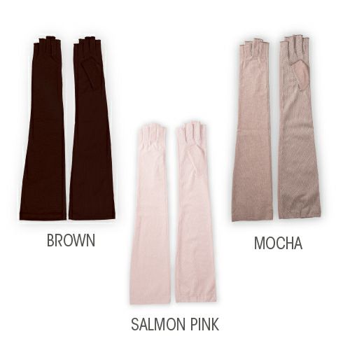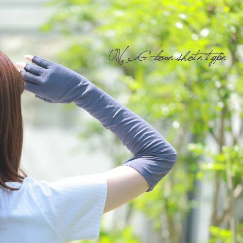 合格書付の接触冷感加工で触れるたびにヒヤッとした涼しい感覚があります。裏側はメッシュで見た目にも涼しくムレにくい仕様。メインの甲部は天然繊維綿50%と天然大豆繊維50%仕様により、お肌にやさしくなめらかな付け心地です。指の先は途中でカットされているデザインなので、装着したままスマホの操作が可能。どのカラーでも紫外線カット率99%以上、かつ少し長めのデザインなので、手首部分までしっかりガードします。