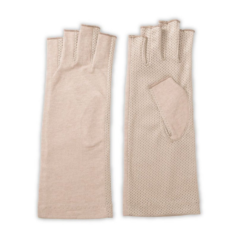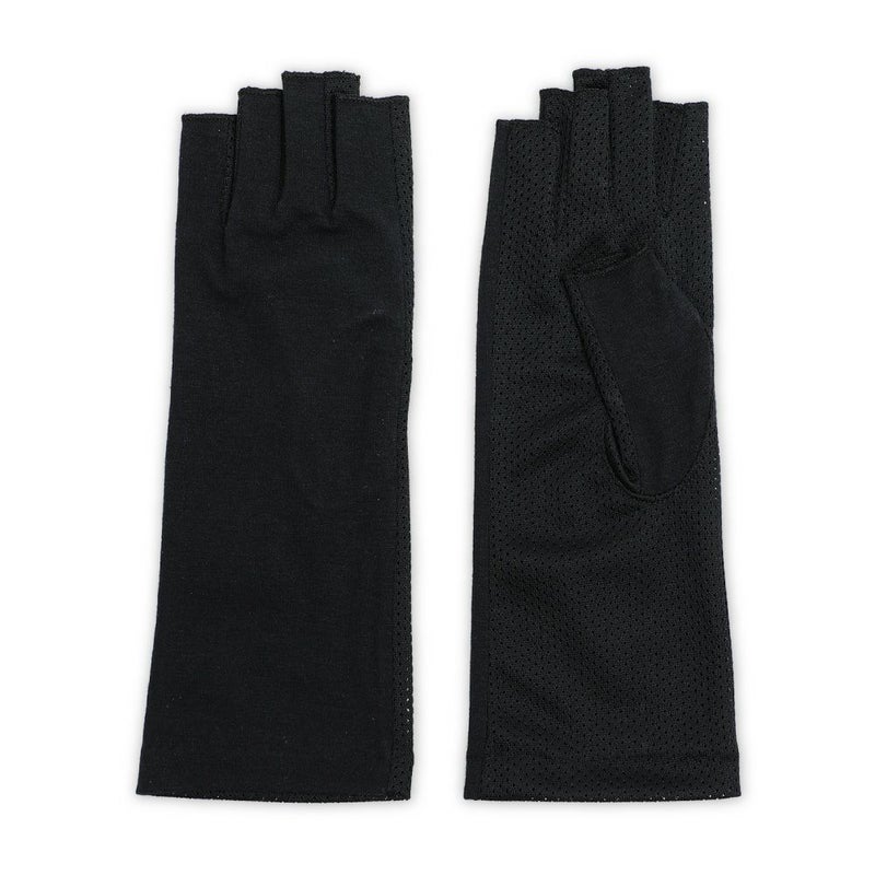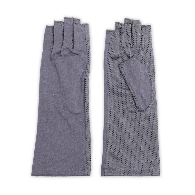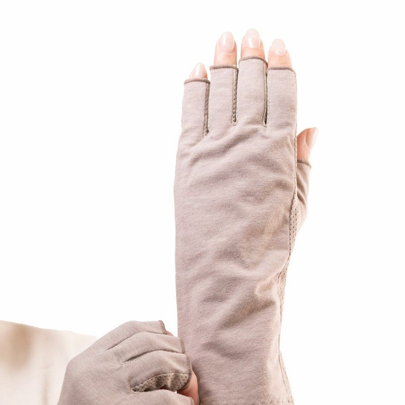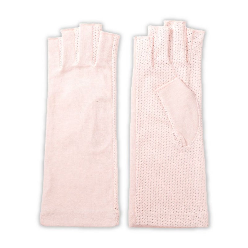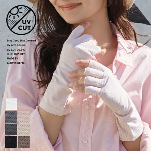 合格書付の接触冷感加工で触れるたびにヒヤッとした涼しい感覚があります。裏側はメッシュで見た目にも涼しくムレにくい仕様。メインの甲部は天然繊維綿50%と天然大豆繊維50%仕様により、お肌にやさしくなめらかな付け心地です。指の先は途中でカットされているデザインなので、装着したままスマホの操作が可能。どのカラーでも紫外線カット率99%以上、かつ少し長めのデザインなので、手首部分までしっかりガードします。