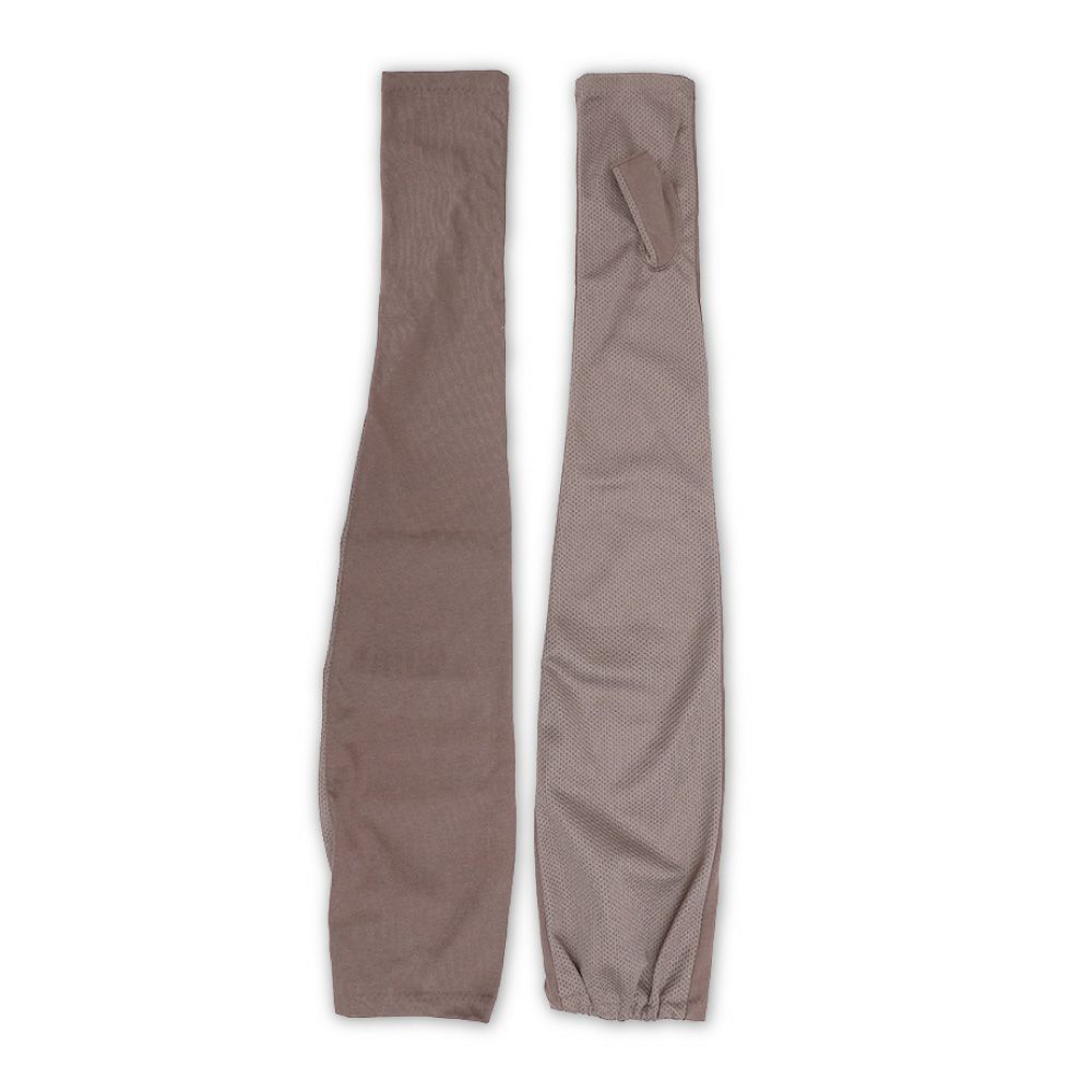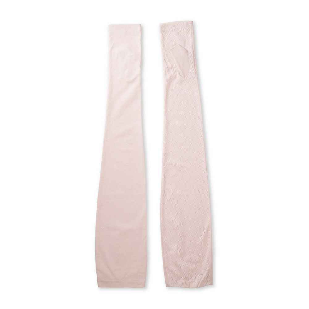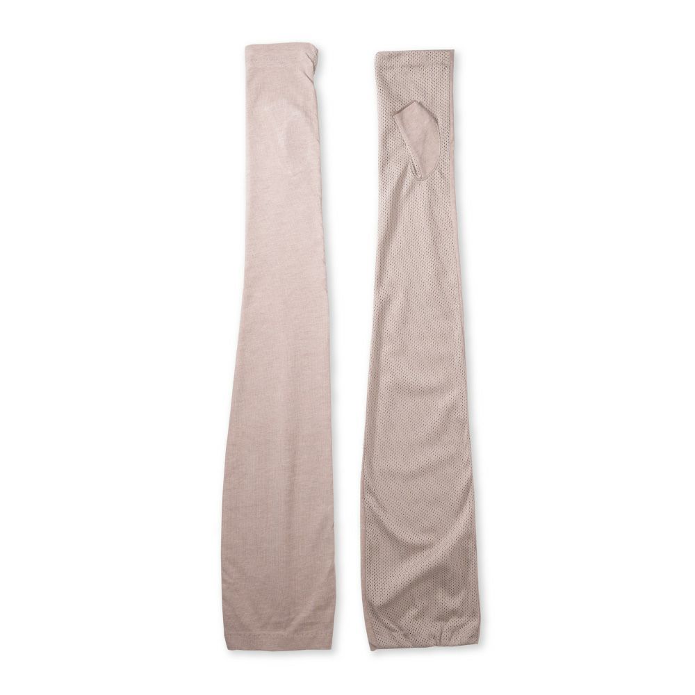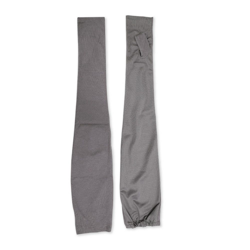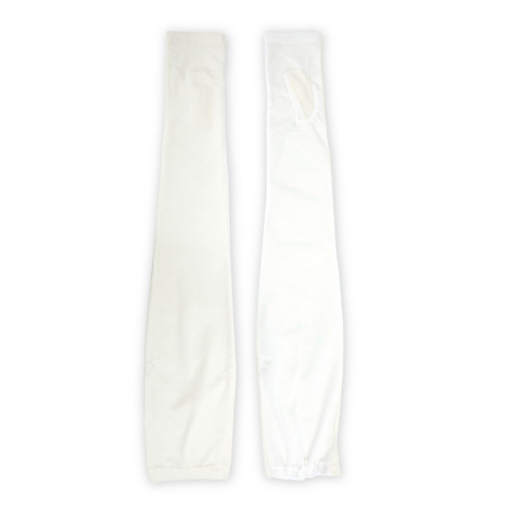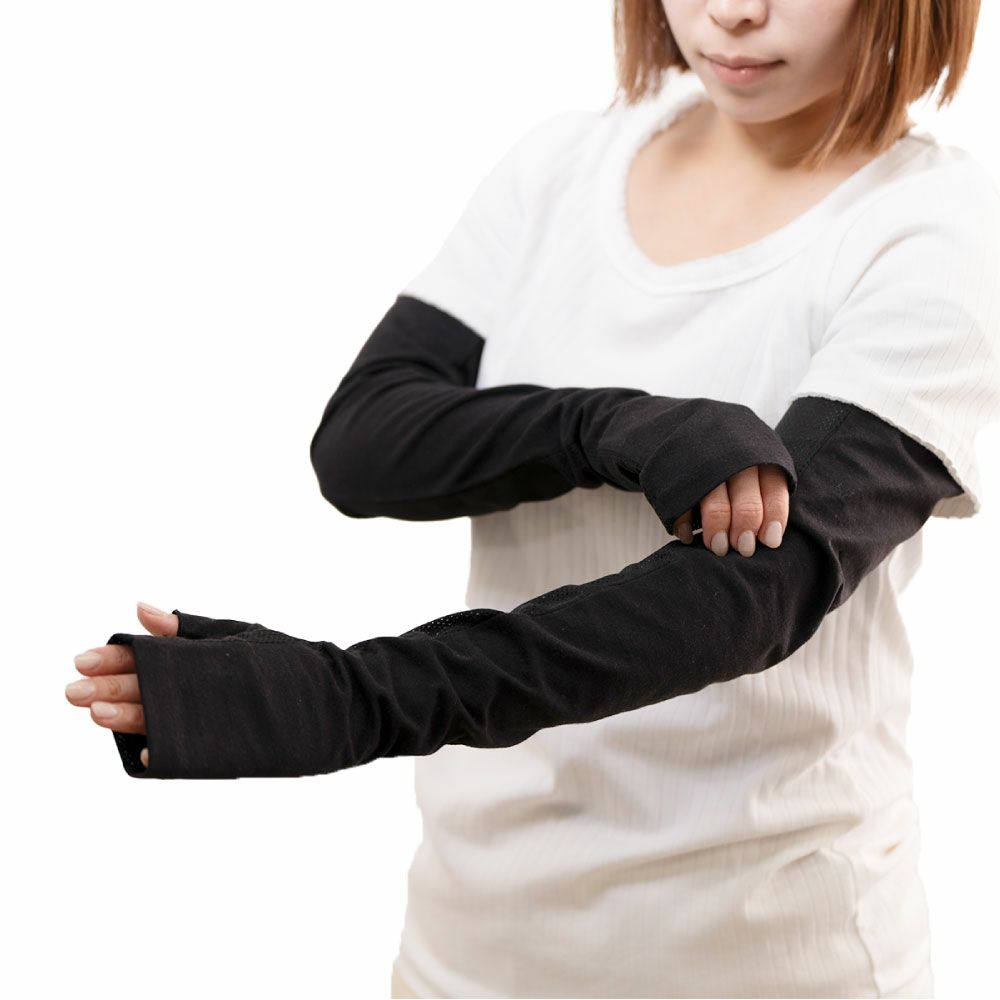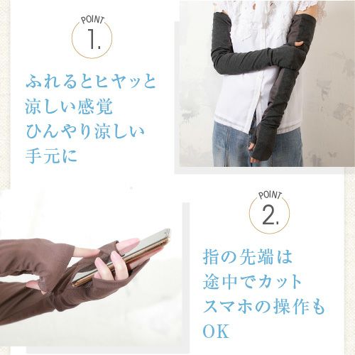 合格書付の接触冷感加工で触れるたびにヒヤッとした涼しい感覚があります。裏側はメッシュで見た目にも涼しくムレにくい仕様。メインの甲部は天然繊維綿50%と天然大豆繊維50%仕様により、お肌にやさしくなめらかな付け心地です。指の先は途中でカットされているデザインなので、装着したままスマホの操作が可能。肩口までの超ロングタイプデザインなので、ノースリー部着用時でもしっかりガードします。