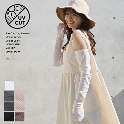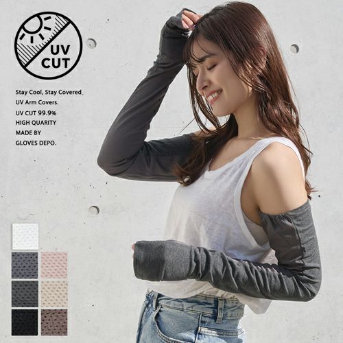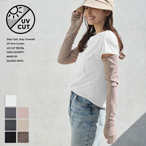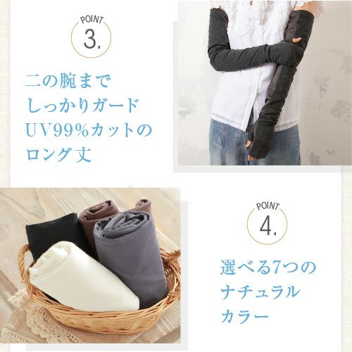 UVカット率99%の合格書付加工で、気になる日差しをしっかりカット。指から二の腕まで長くガードできるので袖の短いトップスの時でも安心です。