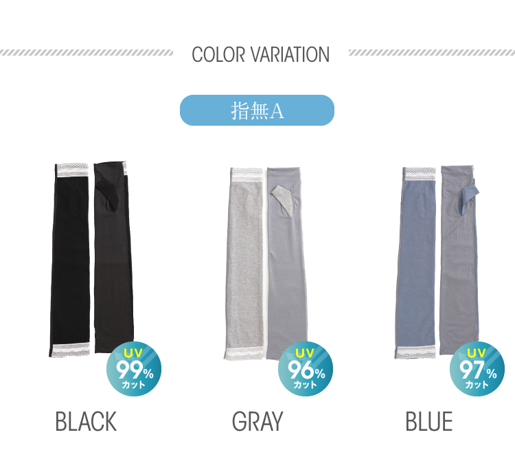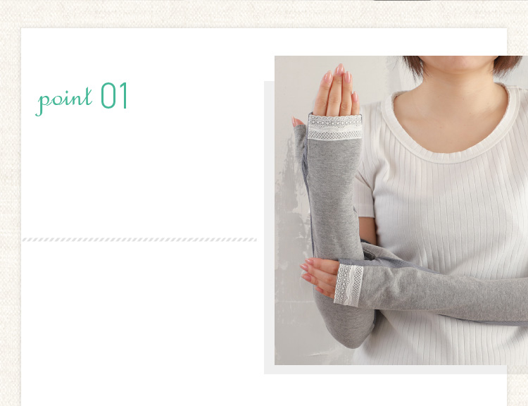 サラサラな肌触りが心地いいヴィンテージ風の生地に上品にレースをあしらったUVカットアームカバー。甲部分の生地は接触冷感で掌側はメッシュ生地で通気性もよく快適さが持続します。それぞれ指切タイプとフィンガーレスの指なしタイプでかつ、柄の違うレースで5パターンのデザインをご用意しました。肘上までガードのロングタイプで半袖やノースリー部着用時でも安心。紫外線カット率は96~99%(カラーにより効果が異なります。)5デザイン×3カラーからお選びいただけます。自転車や車の運転やガーデニングやお散歩、冷房対策などあらゆるシーンに活躍するアームカバー、スマホの操作も可能です。おしゃれに紫外線対策。