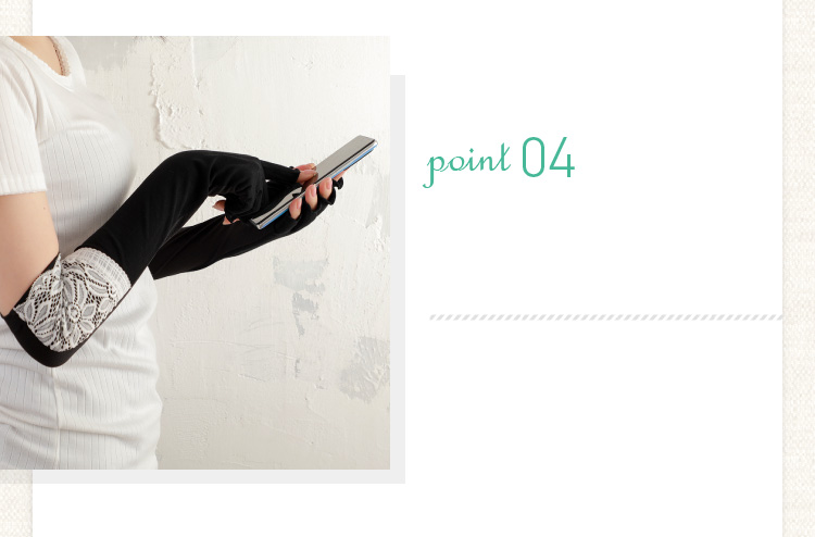 サラサラな肌触りが心地いいヴィンテージ風の生地に上品にレースをあしらったUVカットアームカバー。