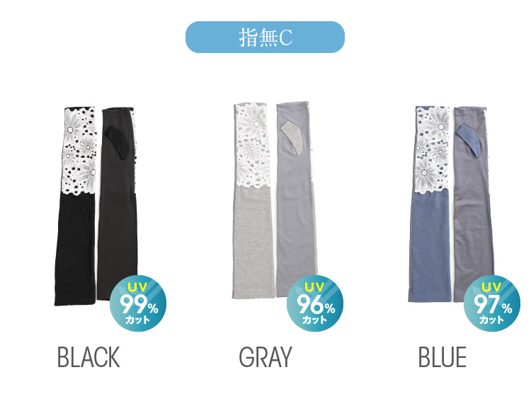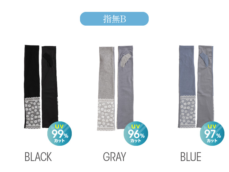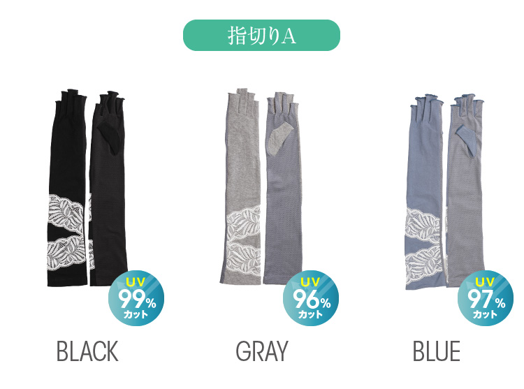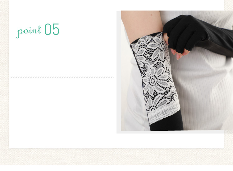 それぞれ指切タイプとフィンガーレスの指なしタイプでかつ、柄の違うレースで5種のデザインをご用意しました。