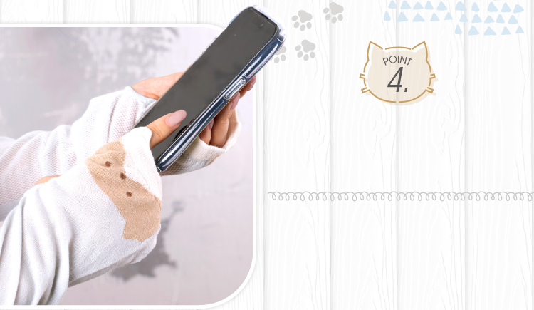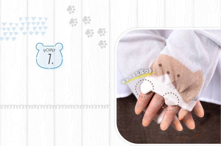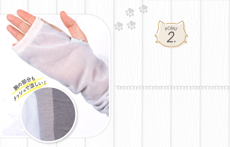 手のひら側はメッシュ編みで蒸れにくく接触冷感加工なのでひんやり涼しいアームカバー、約60cmのロングタイプなので肘上までしっかりガード、指無タイプなのでスマホや細かい作業もラクラク。デザインはかわいいネコや犬などの計4種類。とってもキュートな商品です。