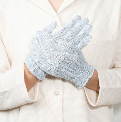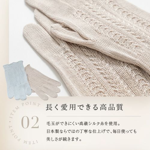 吸湿性・放湿性・保湿性に優れた「天然繊維シルク」。お肌に最も近い天然繊維と言われるほど人体への生体適合性が高く、刺激がないため、アレルギー体質の方にも安心してご使用いただける「シルク100%の手袋」です。しかも、日本製の糸を使い、日本で編み立てをしている素材から生産まで、安心の日本製レディース手袋、毛玉にもなりにくいシルク糸を使用。なんと言っても、一年を通して使えるのがシルクのスゴイところ♪夏は汗を吸収し、余分な水分を放出してくれるので、肌触りサラサラの快適な付け心地♪乾燥が気になり出す寒い冬には、インナー手袋として、モコモコ手袋の下に履くことで、ベタつきやムレもなく、素肌に直接履くより快適な肌触りをご実感いただけます。冬の夜にも手袋を着用したまま就寝してシルクが潤いを逃しません。お休み手袋としても乾燥にお悩みのレディースにおススメ。