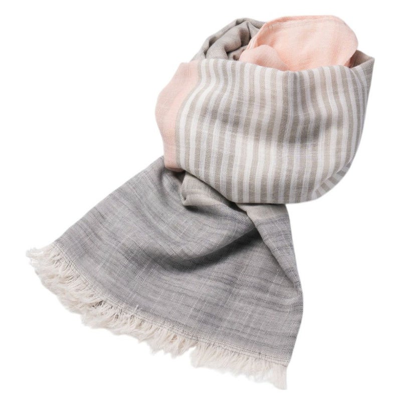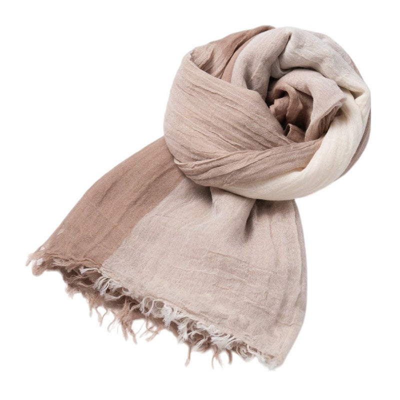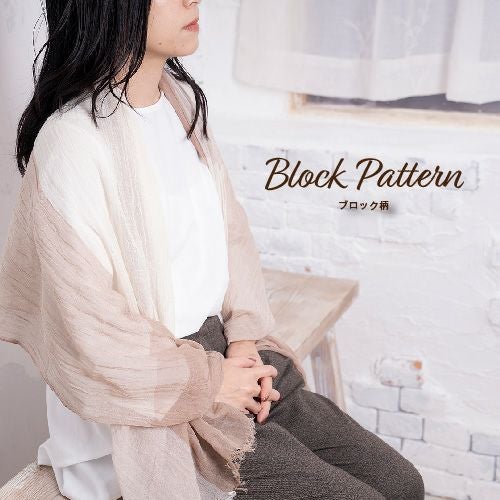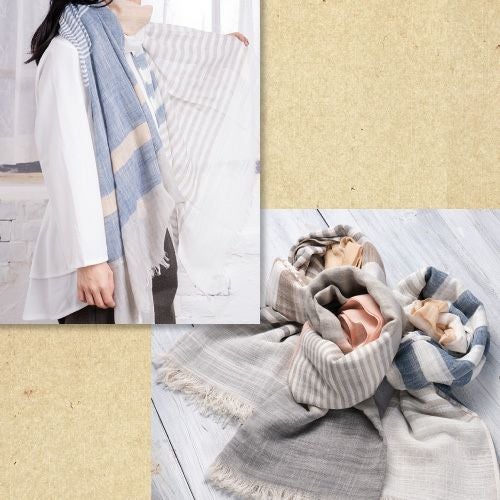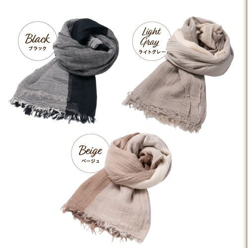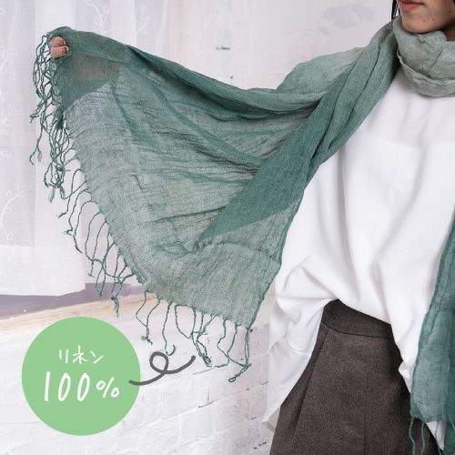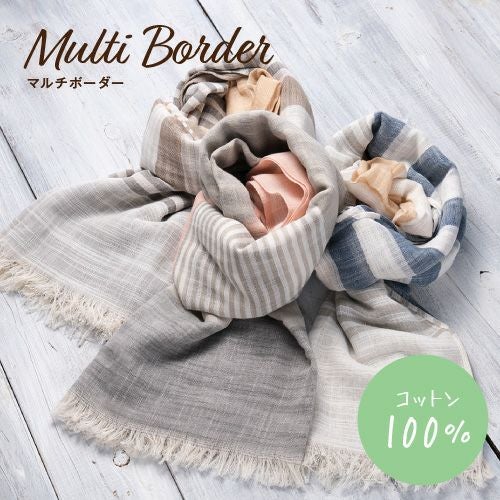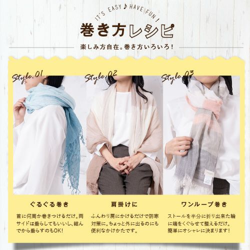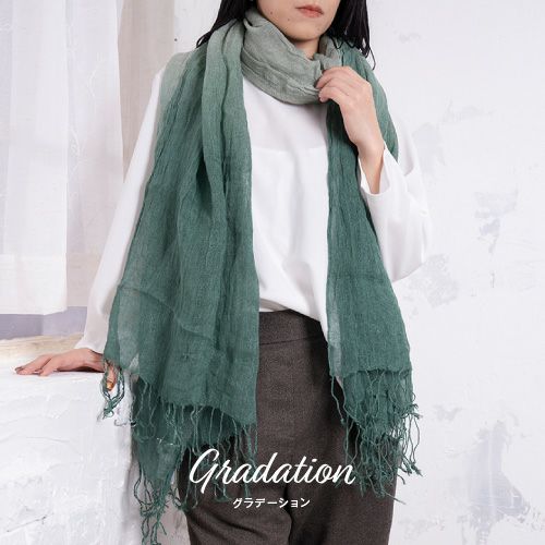 やわらかな綿素材と相性のいいブロックタイプとマルチボーダー、くすみカラーでいろいろなコーデに合わせやすい。リネンのグラデーション柄で巻いた部分で色が変わりきれいに着用可能。