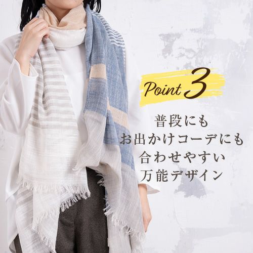 お肌に優しい上質の天然素材のコットン100%とリネン100%なので肌触りも柔らかく吸水性に優れたストールです。約180cm×80cmの大判タイプなので、首回りをしっかりガード。首元をすっぽり覆うことが出来るので、エアコンのきいた乗り物や建物の中で羽織れば、冷房対策にも使えます♪ブロックタイプ、マルチボーダー、グラデーションと3シュルのデザインをご用意いたしました。落ち着いた上品さを醸し出します。エレガントにもカジュアルにも、あらゆるコーデに合わせやすく、幅広い年齢層の方にご愛用いただけます。