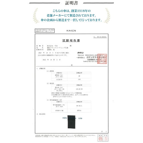 長い年月で培われた職人技から生まれた 本製品生地はJIS L 1092試験の結果最高ランクである撥水等級5級が実証されております。 日傘だけでなく、雨傘としても最高のパフォーマンスを提供します。 ☆「210T」布地を使用していおり、一般的な布傘よりも密度の高い生地をなっております。